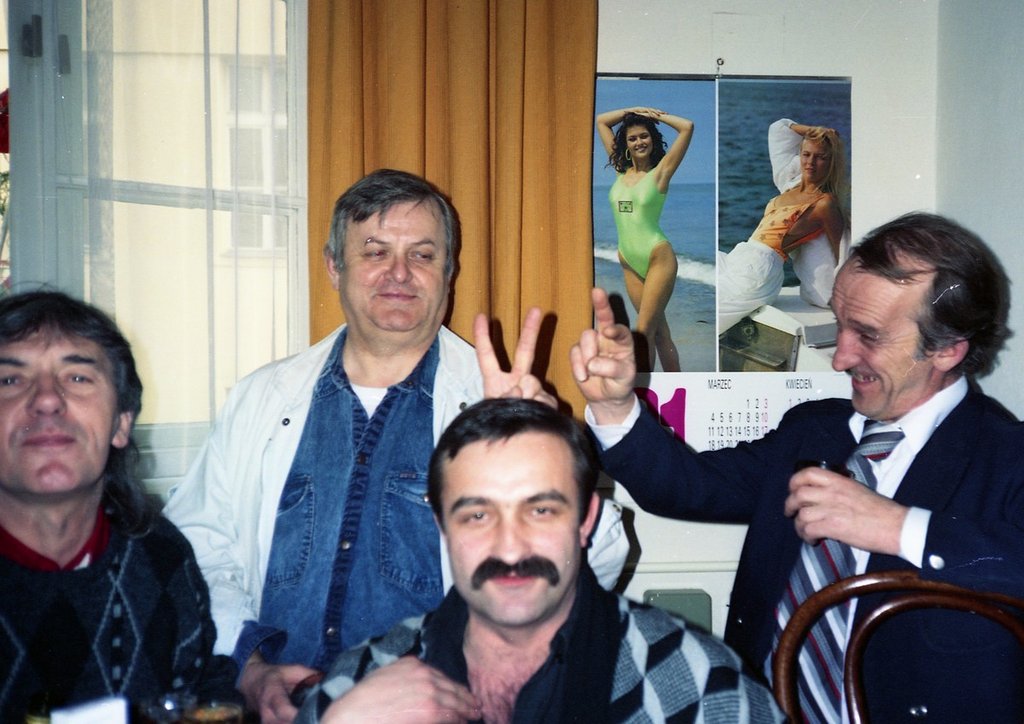 Od lewej: Janusz Dąbrowski choreograf, Leopold Dzikowski fotoreporter Sztandar Młodych, Ryszard Kabanow scenograf, Janusz Gołąbiewski redakcja Sztandar Młodych. autor zdjęcia Jerzy Szam